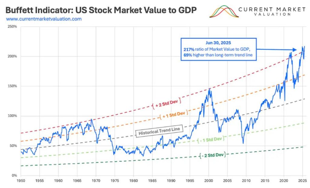 Warren Buffett once called the market cap-to-GDP ratio “probably the best single measure of where valuations stand.” As of October 2025, this indicator sits between 217% and 226%.